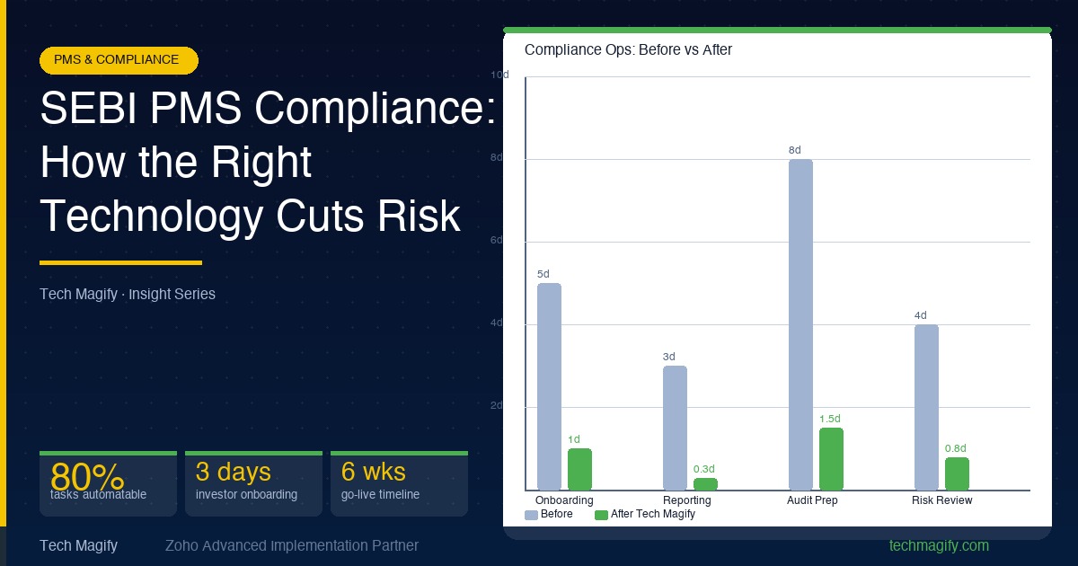 SEBI PMS Compliance: Technology to Cut Operational Risk 90%reduction in compliance-related manual errors 48 hrsfaster SEBI regulatory report generation 6 weekstypical Tech Magify compliance automation