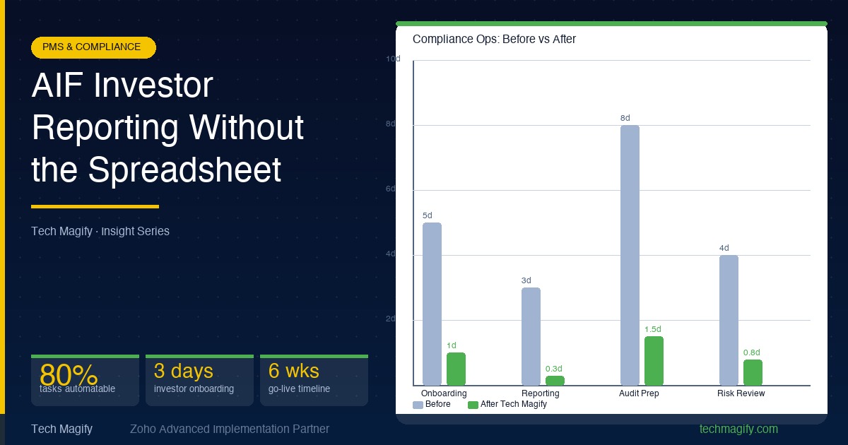 AIF Investor Reporting Without Spreadsheet Chaos 70%reduction in report preparation time after automation 48 hrsaverage turnaround for monthly investor statements 5 weekstypical Tech Magify AIF